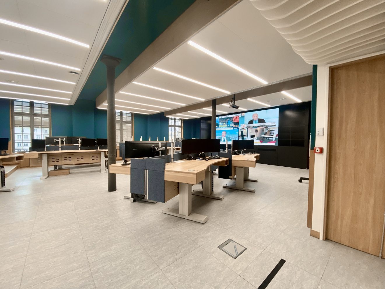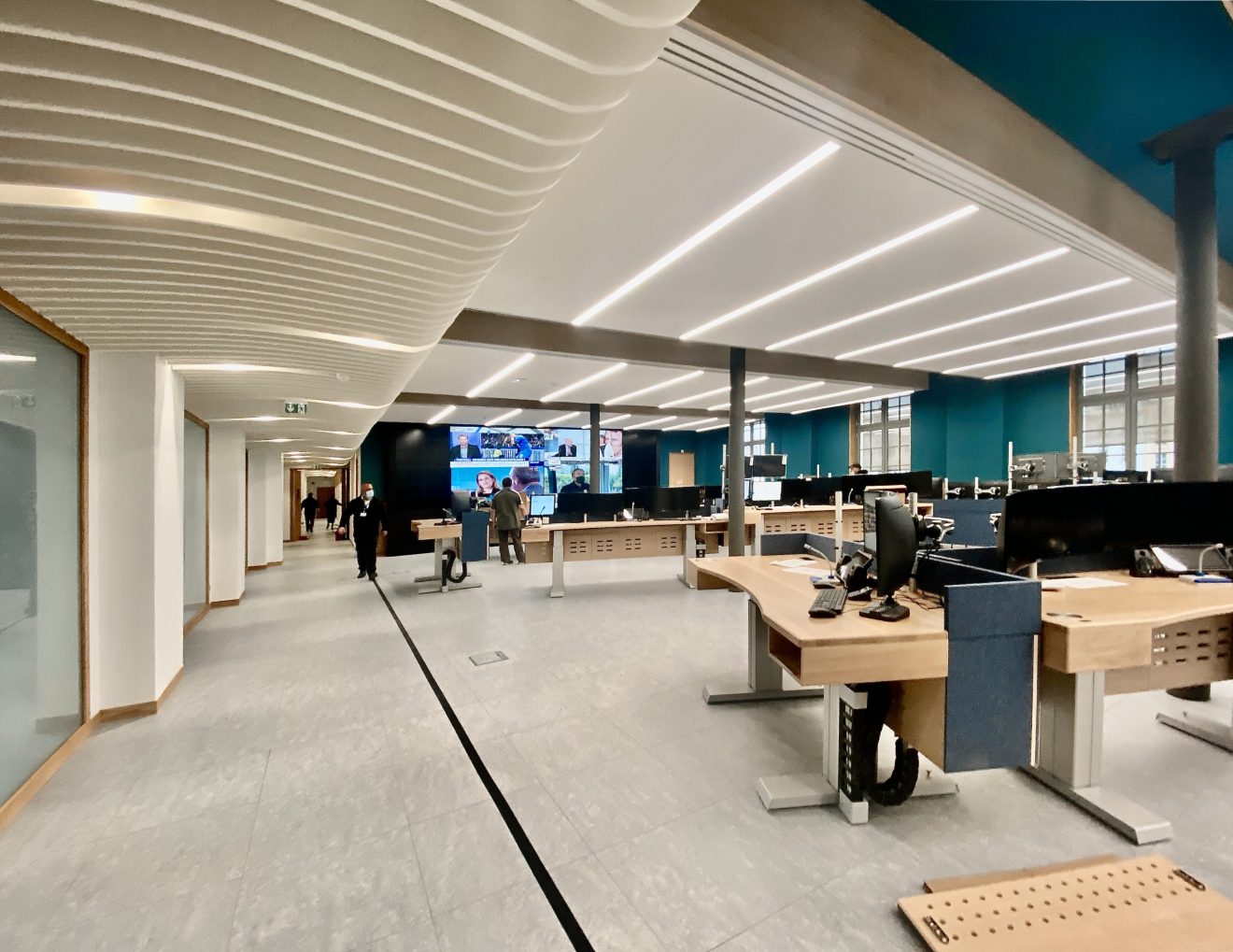 Au cœur de la préfecture, l’aménagement de la salle réalise la réunion des services de supervision de sécurité nationale, régionale ainsi que des transports publics d’Ile-de-France. La salle, réalisée en concertation avec les services, met en place les moyens d’une totale évolutivitée dans le temps. Les opérateurs ayant des durées de travail allant jusqu’à douze heures successives, nous avons cherché à créer un cadre de travail chaleureux, serein, feutré et domestique avec l’emploi de matériaux nobles, bois de chêne, tentures de tissus, feutre acoustique pour le mobilier.