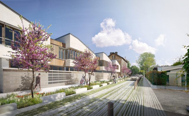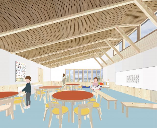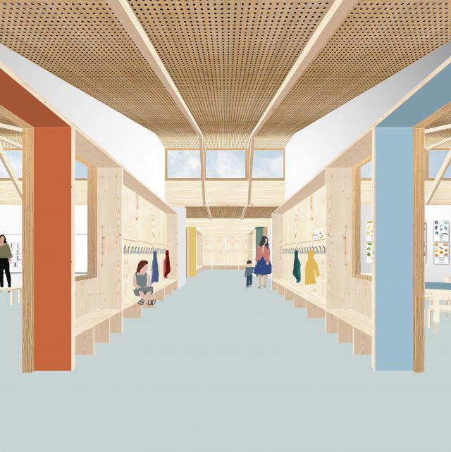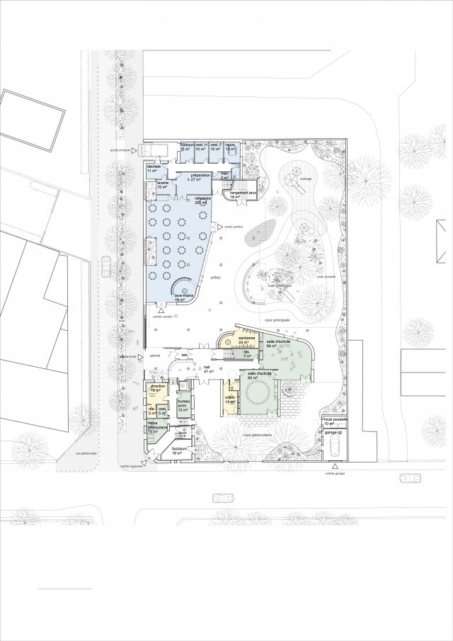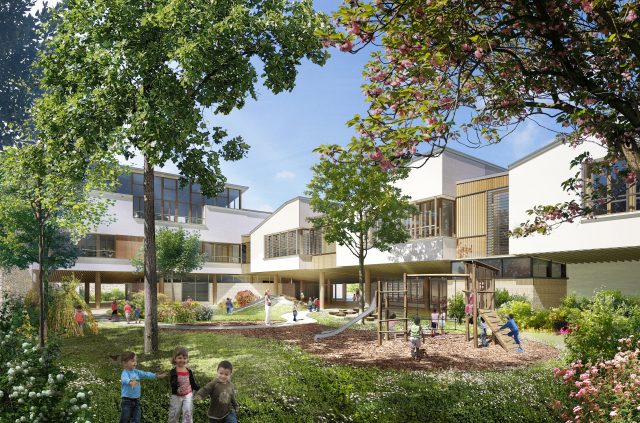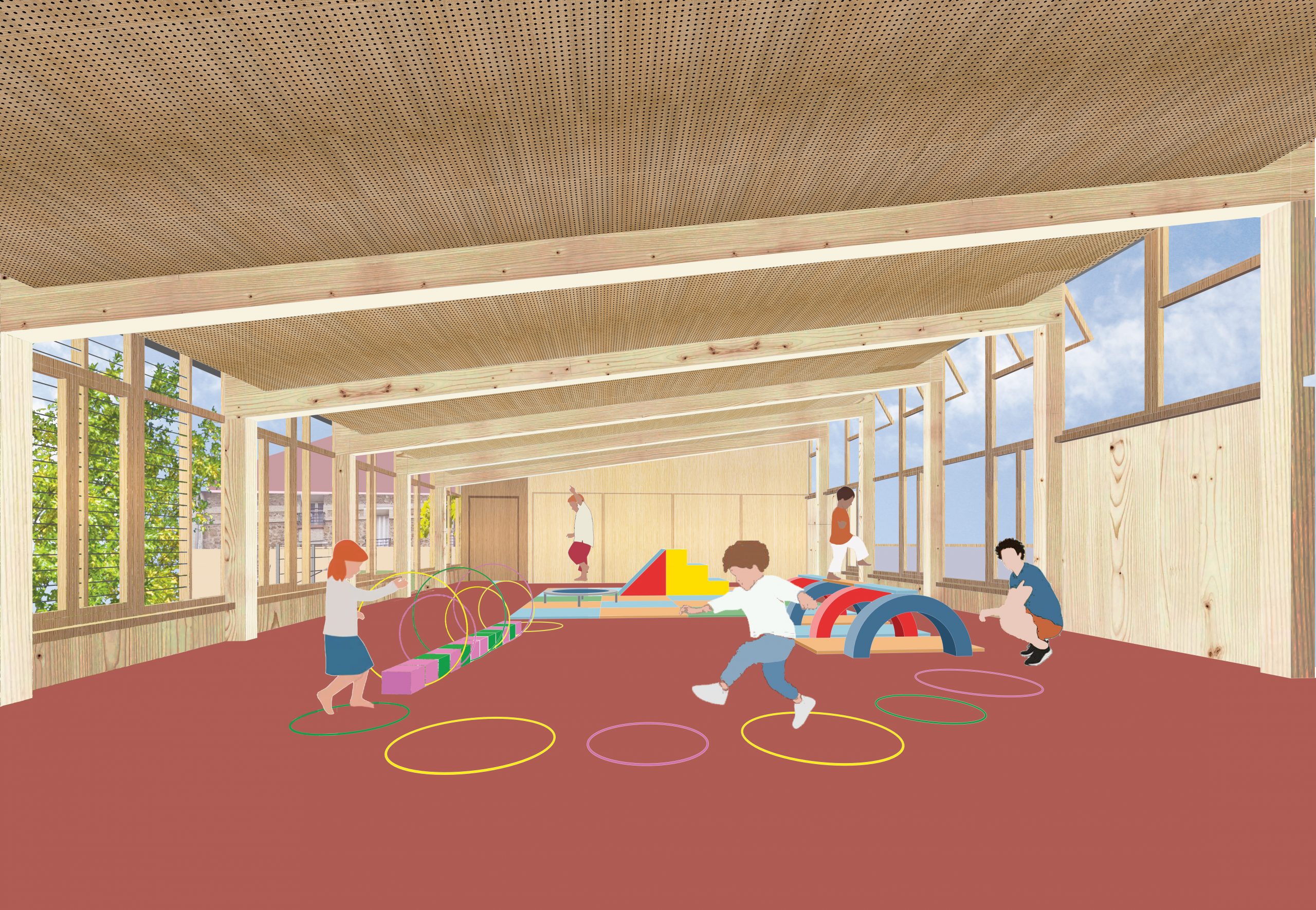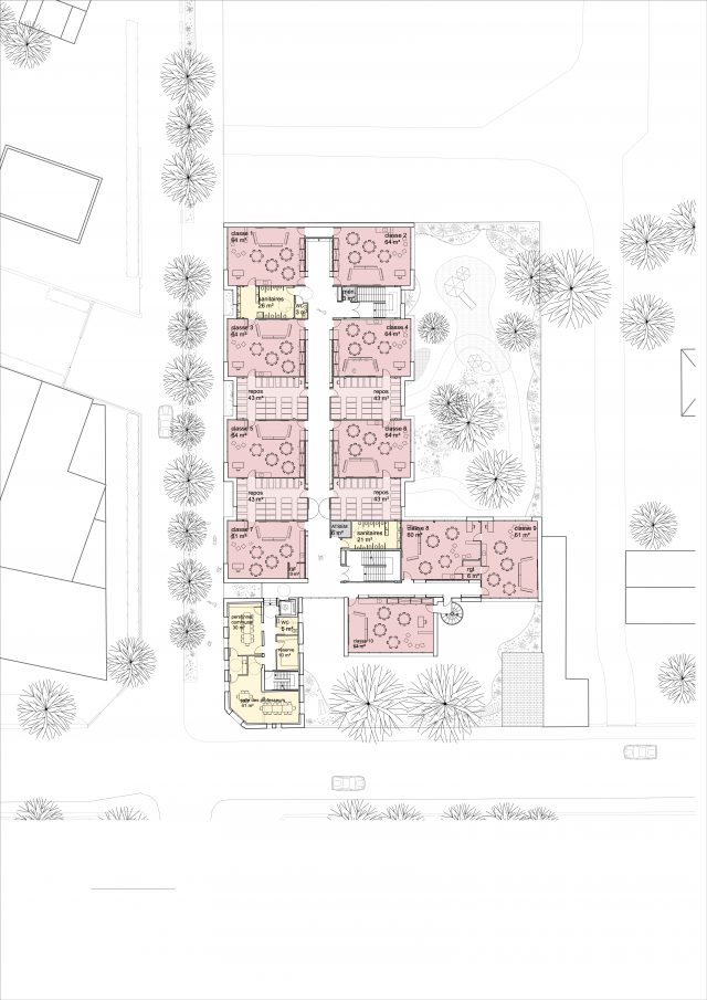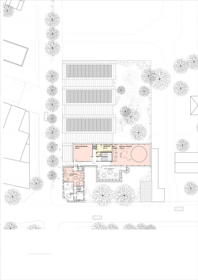 Offrir à l’enfant un environnement propice à l’épanouissement personnel, dans un bâtiment qui répond à la nécessaire adaptation aux changements climatiques et qui œuvre à la réduction des effets par des modes constructifs frugaux. par de petites « maisonnées-classes » suspendues, à l’échelle de l’enfant, en retrait de l’ancien bâtiment.