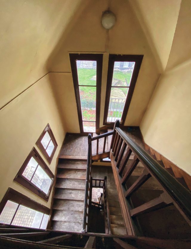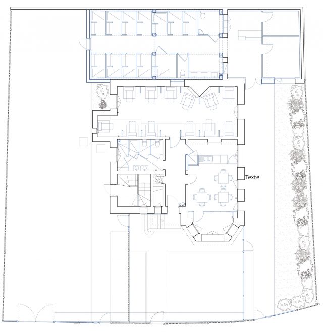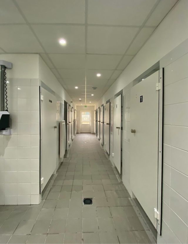 La ville a souhaité dans le même temps, créer des bains douches qui, eux, fonctionnent la journée. Le garage atelier existant a été prolongé pour inclure des cabines et des sanitaires, ainsi que la partie administrative et le stockage des produits de soins corporels. L’ensemble est discret en retrait de la prestance du pavillon devenu Halte de nuit.